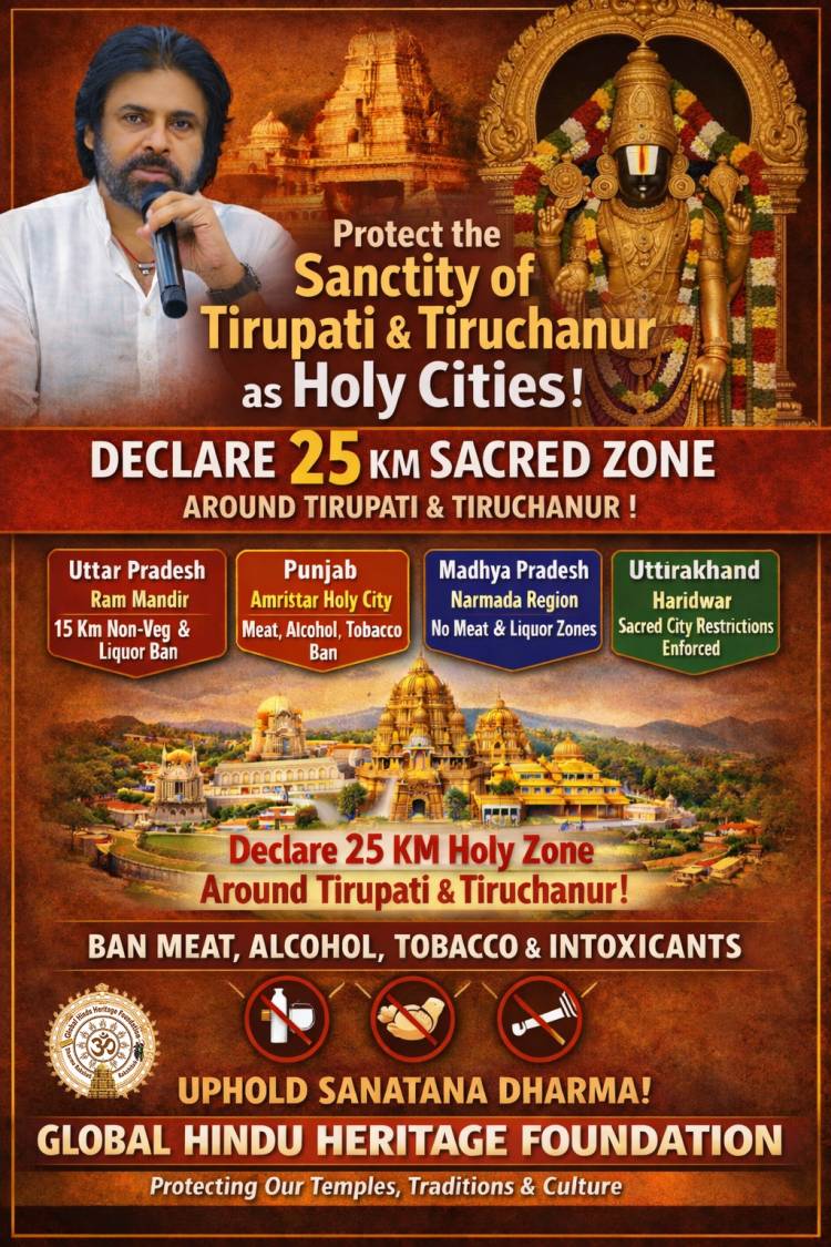 Global Hindu Heritage Foundation requests you to maintain the sanctity of Tirupati and Tirumala in the manner of Tirumala, or to follow the examples of Uttar Pradesh, Punjab, Uttarakhand, and Madhya Pradesh. We request that you introduce a bill in parliament to see that the sale of meat, alcohol, tobacco, non-vegetarian food, and any intoxicating substances will be completely prohibited.
