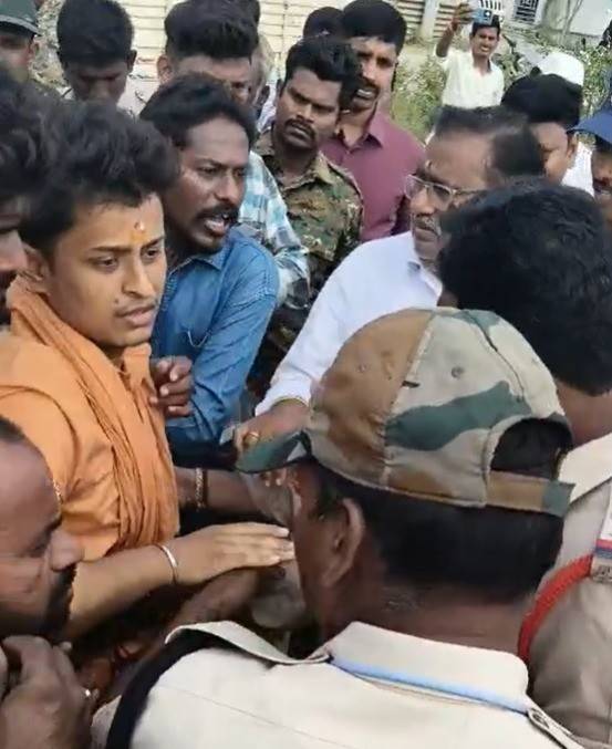 The majority of those who arrived, claiming to be Municipal staff, were non-Hindus. They behaved very disrespectfully with the devotees who came to protect the temple. The most outrageous part was that some of them went to the extent of threatening the devotees, saying, "We are MLA Nazir Ahmed's people." A Muslim individual treated the devotees wearing the Ayyappa Mala very vilely. Although they tried to provoke the devotees, the devotees maintained restraint and temporarily saved the temple.